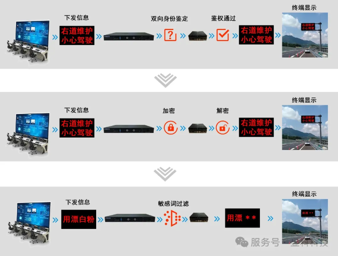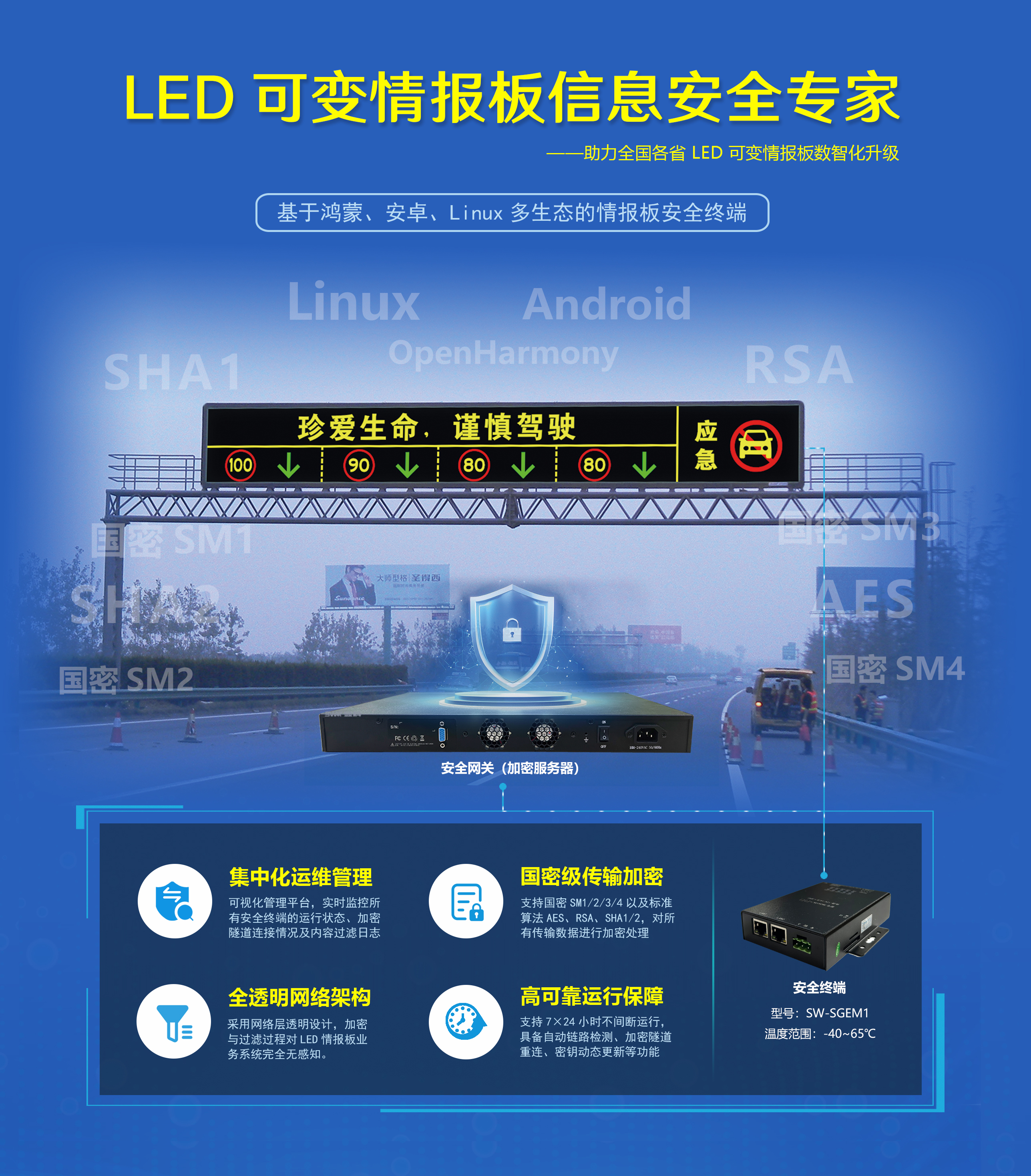 显科信息安全系统采用“安全网关+安全终端”的双向协同架构,构建起从管控中心到终端设备的全流程安全闭环。 管控中心发布平台发出的各类交通信息,经安全网关加密处理后传输至现场每一块LED可变情报板的安全终端,全过程实现双向身份认证,只有通过双重校验的安全信息才能最终呈现,彻底封堵了信息被监听、截取、篡改的风险漏洞。 这种端到端的硬加密防护模式,不仅符合国家对交通数据安全的严格要求,更适配高速公路设备分散部署的场景特点,确保了跨区域路网调度指令的精准落地。